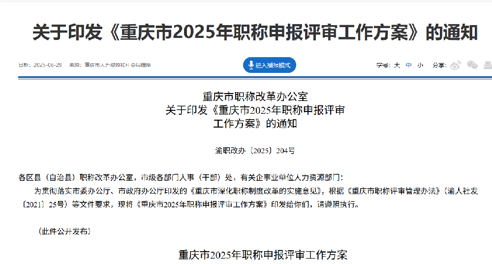 《重慶市2025年職稱申報評審工作方案》的通知?渝職改辦〔2025〕204號文件···